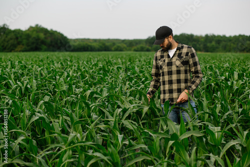 Young male agronomist standing in a corn field, checking plant health and growth. Concept of crop monitoring, modern agriculture and sustainable farming.