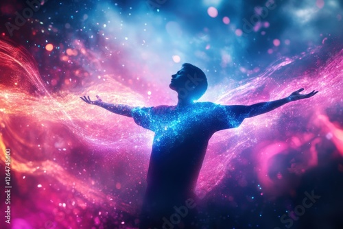 young, male, cosmic, energy, abstract, galaxy, vibrant, colourful, universe, star, nebula, silhouette, arm, extended, light, glow, fantasy, dreamlike, magical, celestial, space, infinite, mystery, imagination, wonder, awe, atmosphere, serenity, exploration, adventure, surreal, aethereal, mood, artistic, expression, calmness, meditation, spirituality, freedom, inspiration, horizon, huge, enchantment, journey, cosmos