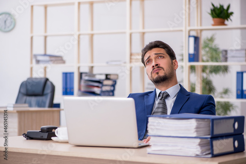Young male employee and too much work in the office