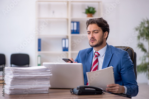 Young male employee and too much work in the office
