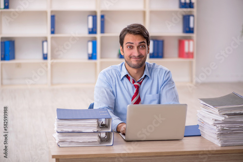 Young male employee and too much work in the office