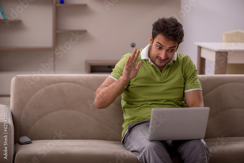 student, home, house, man, young, working, from, computer, laptop, online, cyberspace, telecommuting, telecommuting, freelance, freelancer, quarantine, isolation, pandemic, virus, social, distance, call, calling, video, telecom, meeting, conference, teleconference, discussing, explaining, waving, hand, virtual, business, businessman, adviser, remote, learning, distant