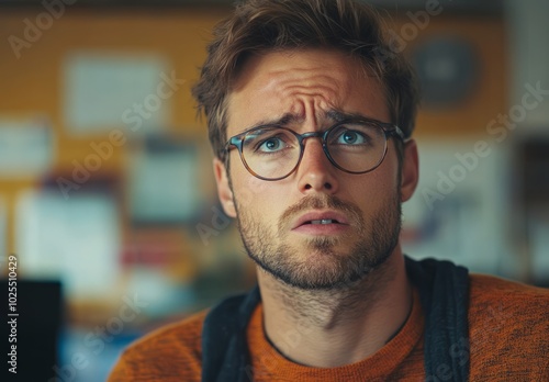 Young male model in casual wear and glasses.