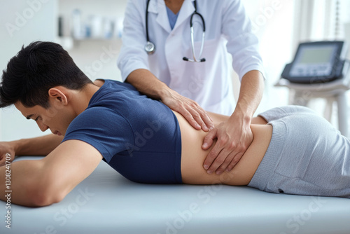 Young male patient with back pain receiving massage from doctor. scene captures clinical setting focused on healing and comfort