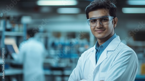 Young Male Scientist in Laboratory with Safety Glasses Smiling at Camera, Laboratory Environment, Medical Research and Scientific Experiments