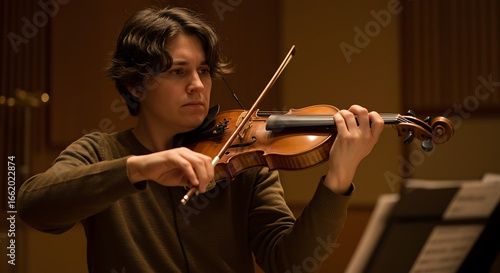male, young, musician, playing, fiddle, instrument, brown, clothing, focused, concentrating, performing, warm, lighting, studio, artistic, music, performance, art, creative, professional, musical, entertainment, sound, practice, concert, orchestra, rehearsal, training, indoor, instrumental, melodic, sitting, concentration, serious, visual