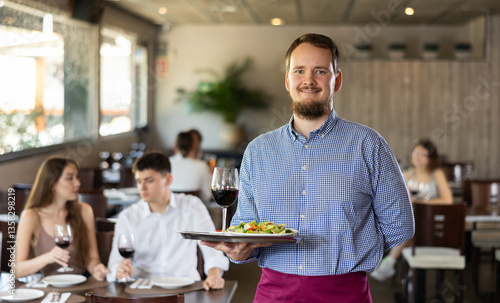 Young male waiter posing with tray of salad and wine in restaurant
