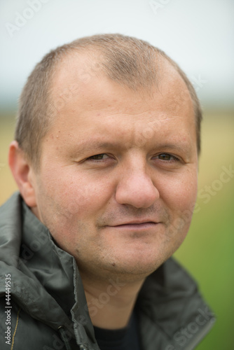 adult, bald, brunette, hair, jacket, look, man, portrait, rain, serious, young