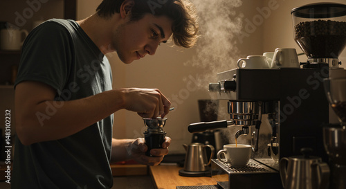 man, hot drink, brewing, espresso, machine, home, kitchen, steam, casual attire, indoor, morning, lifestyle, preparation, drink, barista, caffeine, hobby, technology, warmth, relaxation, cooking, teenage, cosy, stylish, culinary, homebrew, craftsmanship, focused, process, cup, mug, utensil, dark, modern, favor, satisfaction, taste, aroma, cafes, kitchen utensile, energy, beverage