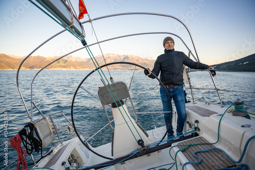Young man captain standing at the helm and controls a sailboat during a journey by sea in winter time in Montenegro