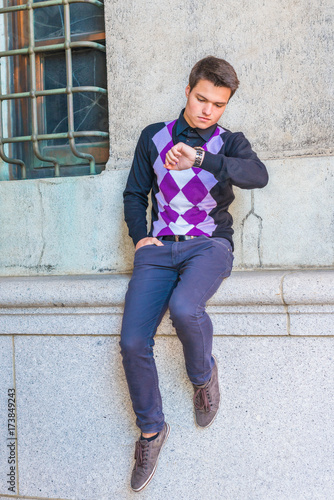 young, youth, photogenic, teenage, teenage, man, boy, male, guy, people, one person, caucasian, lifestyle, student, purple, pink, black, white, sweater, pant, trousers, sneaker, shoe, watch, east, european, cute, smart, elegant, fashion, fashionable, casual attire, spring, autumn, style, stylish, waiting, window, wall, street, city, urban, outside, time, wristwatch, date, meeting, patient