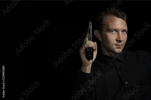 man, portrait, dark, eye, handgun, background, business, fashion, person, face, black, people, adult, guy, male, young, head, closeup, expression, lifestyle, look, serious, casual attire, dramatic, emotion, key, low, stare, gun, smile