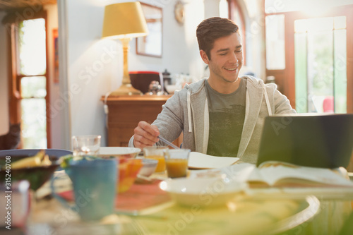 Young man college student using laptop studying at breakfast