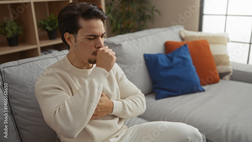 man, coughing, indoor, sofa, young, home, living, room, cushion, relaxed, casual attire, sick, interior, natural, light, houseplant, male, seated, calm, cosy, apartment, hispanic, person, adult, photogenic, comfort, latin, pensive, furniture, domestic, homelike, decor, stylish, mood, serene, quiet, scene, relaxation, serious, environment, space, ambience, gentle, portrait, private, intimate, minimalist, attractive, daylight