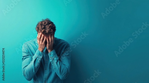 man, frustration, emotion, mental health, stress, despair, sorrowful, blue background, hand, face, gesture, anxiety, hopelessness, isolation, portrait, youth, mood, expression, well-being, discomfort, vulnerability, solitude, dramatic, deep thought, tension, contemplation, lifestyle, indoor, closeup, reaction, depression, facial expression, body language, communication