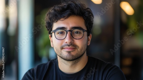 man, portrait, goggles, dark, hair, curly, face, young, adult, casual attire, shirt, black, background, blurred, indoor, neutral, expression, calm, serious, friendly, contemplative, thoughtful, simple, clean, clear, sharpened, sharp, closeup, shoulder, neckline