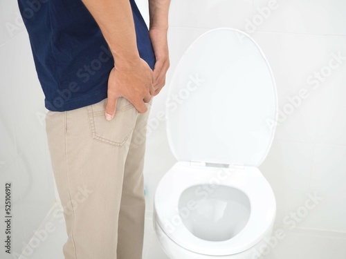 Young man has diarrhea holding his butt in toilet, diarrhea constipation. Health concept. Closeup photo, blurred.
