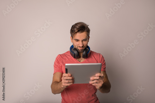Young man having an exciting online game via portable touch pad computer while standing isolated in studio against grey wall with copy space background for promotional content