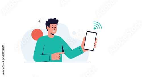 Young man holding a smartphone displaying a blank screen with wireless signal icons indicating connectivity and communication technology