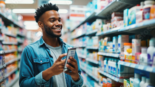 pharmacy, man, smartphone, shopping, health, client, medication, retail, aisle, apothecary, store, health care, young, adult, shelf, product, modern, technology, female, browsing, indoor, standing, casual attire, medicine, wellness, choice, concentration, drug, personal, care, cosmetic, consumer, service, prescription, contemplation, selection, variety, urban, lifestyle, contemporary, establishment, business, bottle, box, professional, background
