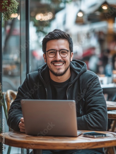 man, laptop, cafes, smiling, outside, urban, table, goggles, modern, happy