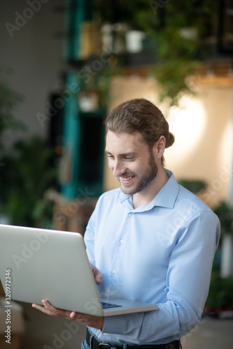 Young man in light blue shirt with laptop in his hands.