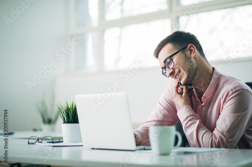 intern, office, mobile phone, phone, talking, laptop, electronic mail, employee, desk, young, administration, boss, student, learning, reading, brainstorming, business, businessman, colleague, communication, employer, feedback, finance, stronger, formal, law, man, manager, marketing, monitoring, problem solving, professional, project, technology, work, working