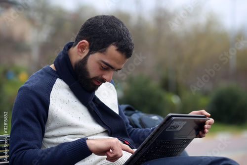 laptop, man, business, park, young, computer, adult, male, technology, nature, happy, businessman, casual attire, white, day, people, sunlight, goggles, sitting, urban, success, typing, cyberspace, smiling, green, notebook, modern, outside, tied-up, hand, shirt, work, beard, bearded, arab, arabic, islam, muslim, middle east, africa, asia, bag, peace, sharpened, condensed, tablet