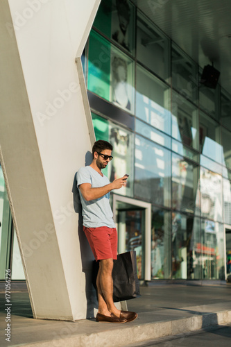 shopping centre, shopping, young, vertical, urban, typing, siam, technology, t-shirt, sunshine, sunny, sunglasses, summer, street, standing, phone, person, people, outside, outdoors, online, 1, mobile phone, man, male, looking, daylight, day, city, chat, mobile phone, caucasian, building, bangkok, alone, adult, adult, 20s, grown-up