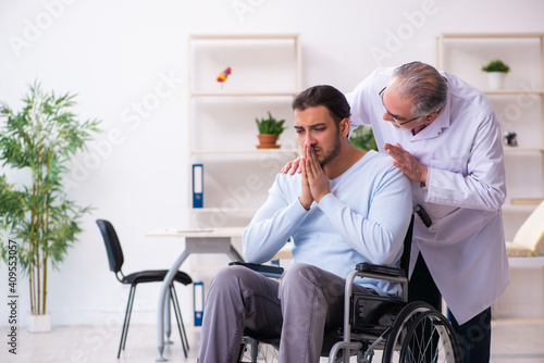 Young man in wheel-chair and old doctor traumatologist