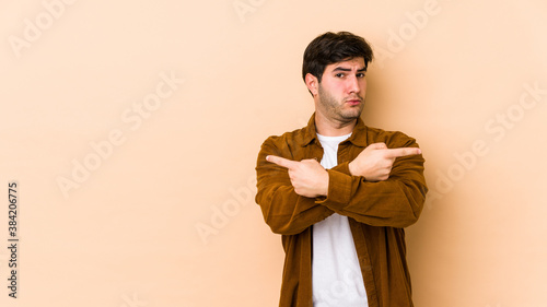 Young man isolated on beige background points sideways, is trying to choose between two options.