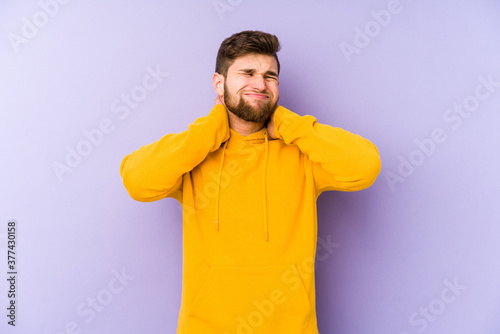 Young man isolated on purple background suffering neck pain due to sedentary lifestyle.