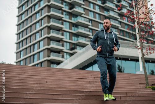 adult, adults only, beard, bodycare, capital city, caucasian, cheerful, city, city landscape, effort, enjoyment, healthy lifestyle, horizontal, jacket, jogging, avocation, lifestyle, lifestyle, man, moving up, one man only, one person, outdoors, people, photo, physical activity, recreational pursuit, running, speed, sport, step, street, urban, vitality, waist up, well-being, young, young adult