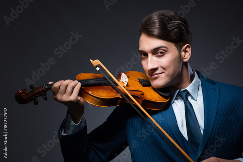Young man playing violin in dark room