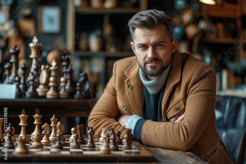 Young man poses thoughtfully next to a beautifully crafted chess set in a cozy cafe setting