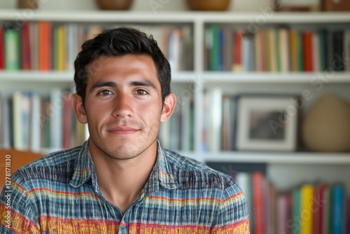 young men, library, smiling, casual attire, dark hair, relaxation, reading, education, culture, leisure, scholarly, lifestyle, creativity, personality, engagement, self-portrait, youth, diversity, calmness, inspiration, storytelling, cognition, modern, contemporary, friendly, closeup, candid, interior design, interest, hobby, intellectual, community, warmth