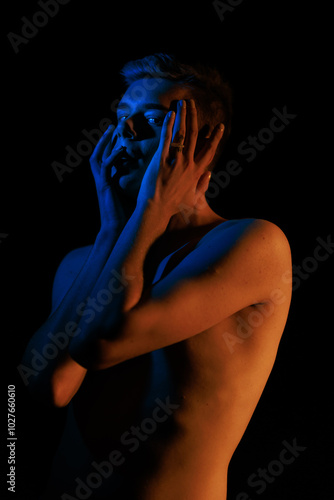 adult, androgynous, beautiful, beauty, bisexual, black, blue, blur, boy, caucasian, dance, dark, diversity, emotion, european, expression, futuristic, gay, gradient, homosexual, man, model, many-coloured, neon, neon light, pose, pride, rainbow, red, sexy, shadow, silhouette, spectrum, studio, tolerance, torso, trans, transgender