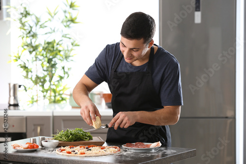 Young man preparing tasty pizza at table