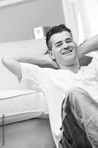 people, man, man, lifestyle, lifestyle, relaxing, sofa, home, eye, interior, downtime, smiling, happy, contentment, arm, life, well-being, serenity, design, white, back, comfortable, emotion, domestic, positive, relaxation, monochrome, living, carefree, peace, young, break, quiet, furniture, happiness, calmness, enjoyment, leisure, 1, up, casual attire, adult, head, closed, room, person, cheerful, modern