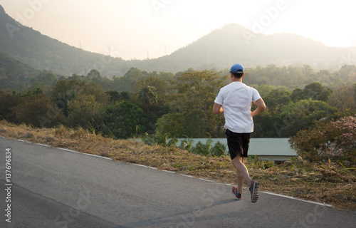 athletic, brown hair, caucasian, copy space, day, direction, enjoyment, exercising, fitness, front view, full-length, happy, health, hobby, horizontal, jogging, avocation, man, movement, nature, one person, open space, outdoors, road, running, solitude, sport, sports shoe, sportsman, summer, sun, sunlight, calmness, vitality, work out