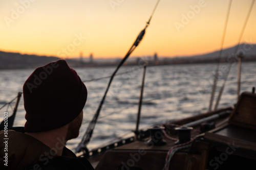 man, landscape, sailing, sailboat, barcelona, boat, coast, beautiful, evening, mediterranean, nature, sea, blue, ocean, lonely, solitaire, introspective, orange, sunset, recreation, sky, vacation, sport, alone, travel, twilight, water, wave
