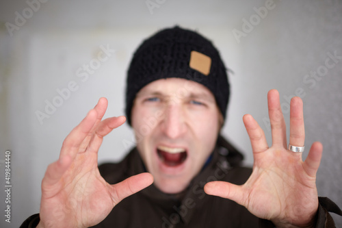 Young man screaming with hands in focus