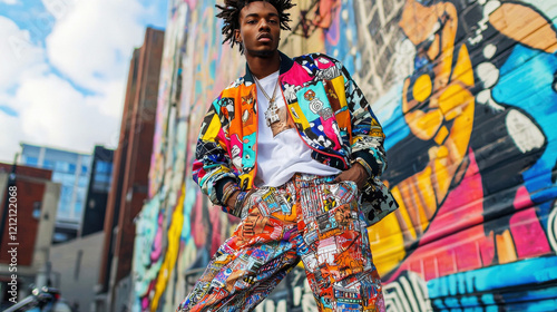 Young man showcases urban street art-inspired fashion against vibrant mural backdrop in artistic district