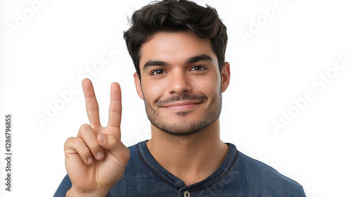 man, young, victory, signs, smiling, portrait, white background, hand gesture, symbol, success, peace, counting, number two, positive, happy, cheerful, confident, casual attire, winner, achievement, motivation, optimism, expression, body language, communication, nonverbal, studio shot, isolated, one person, male, adult, latin, hispanic