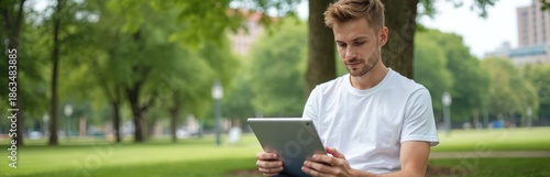Young man sits in green park holding tablet computer. He looks at the screen intently, dressed in a casual white t-shirt. He is focused on his digital device while enjoying nature.