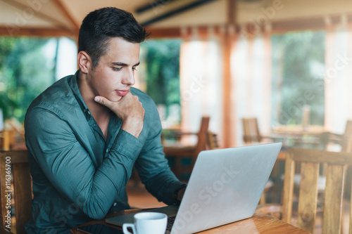 Young man sitting at cafe and working on laptop