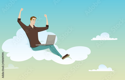 Young man sitting on the cloud looking his computer happy for success on sunny weather.