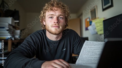 man, young, student, studying, desk, room, cluttered, paper, laptop, work, homework, learning, education, college, university, reading, sharpened, condensed, serious, portrait, person, male, boy, teenage, indoor, home, lifestyle, workspace, office, book, document, technology, computer, research, writing, thinking, expression, face, hair, beard, casual attire, white, paper