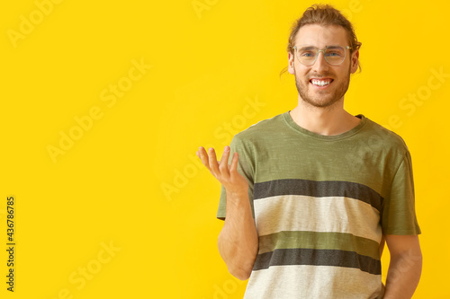 Young man wearing eyeglasses on color background