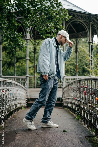young, man, white, sneaker, crossing, wooden, bridge, scenic, park, setting, active, outdoors, adventure, leisure, walk, stroll, green, foliage, tree, path, sun, sky, cloud, lake, duck pond, grass, plant, landscape, nature, exercise, urban, explore, journey, peaceful, tranquil